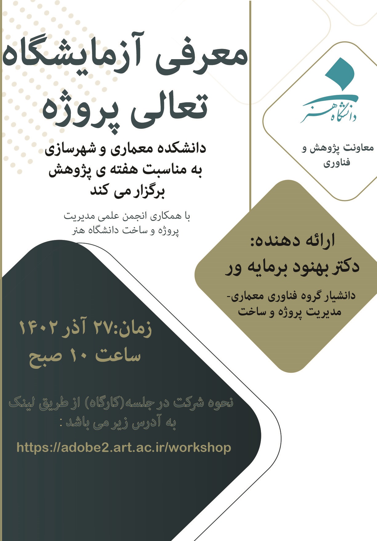 همزمان با هفته ی پژوهش دانشکده معماری و شهرسازی با همکاری انجمن علمی مدیریت پروژه و ساخت برگزار می کند: معرفی آزمایشگاه تعالی پروژه