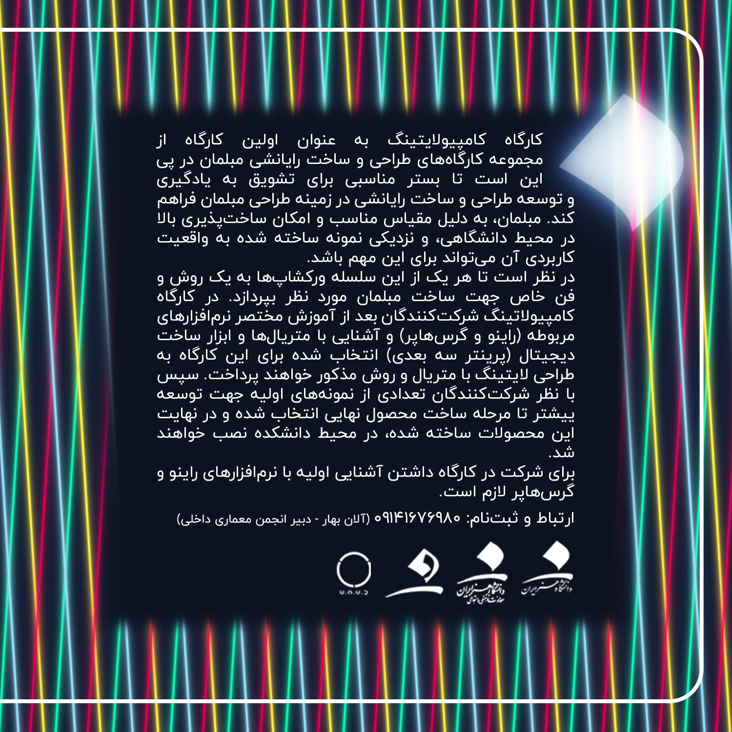 کارگاه کامپیولایتینگ بهعنوان اولین کارگاه از مجموعه کارگاههای طراحی و ساخت رایانشی مبلمان در پی این است تا بستر مناسبی برای تشویق به یادگیری و توسعه طراحی و ساخت رایانشی در زمینه طراحی مبلمان فراهم کند. در این کارگاه به طراحی لایتینگ با استفاده از ابزار طراحی رایانشی و ساخت آن با ادوات ساخت رایانشی خواهیم پرداخت.