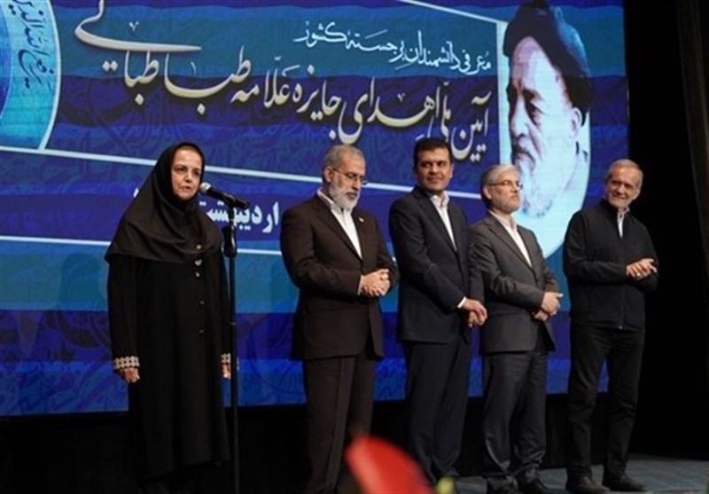 به گزارش خبرنگار اجتماعی خبرگزاری تسنیم، آیین اهدای جایزه علامه طباطبایی (ره) با حضور مسعود پزشکیان رئیسجمهوری، حسین افشین معاون علمی، فناوری و اقتصاد دانش بنیان ریاست جمهوری و رئیس بنیاد ملی نخبگان، حسین سیمایی صراف وزیر علوم و جمعی دیگر از مقامات کشور، اساتید، نخبگان و برگزیدگان ادوار مختلف جایزه علامه طباطبائی برگزار شد.