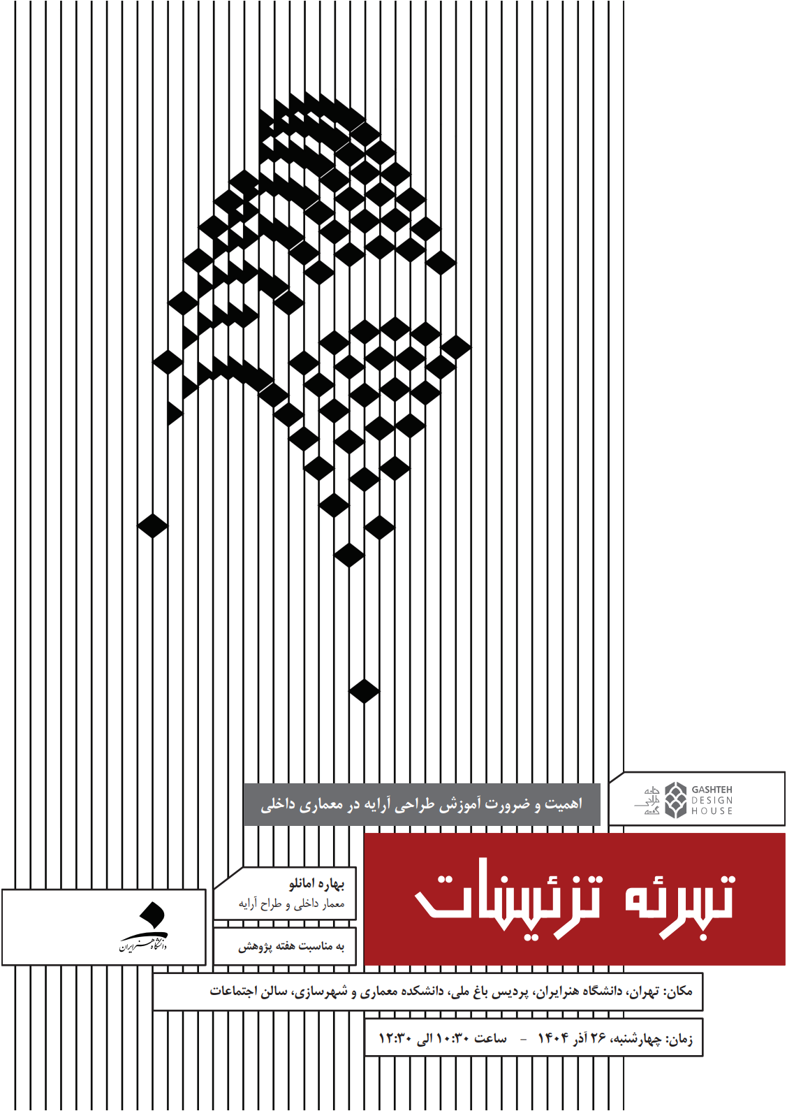 سخنرانی خانم مهندس بهاره امانلو در هفته پژوهش اهمیت و ضرورت آموزش ارایه در معماری داخلی ۱۵ آذر ۱۴۰۴ | ۱۴:۳۷ کد : ۷۳۷۵ در دانشکده چه میگذرد؟ ارسال به دیگران نام شما ایمیل شما ایمیل دریافتکننده ارسال انصراف تعداد بازدید:۳۷