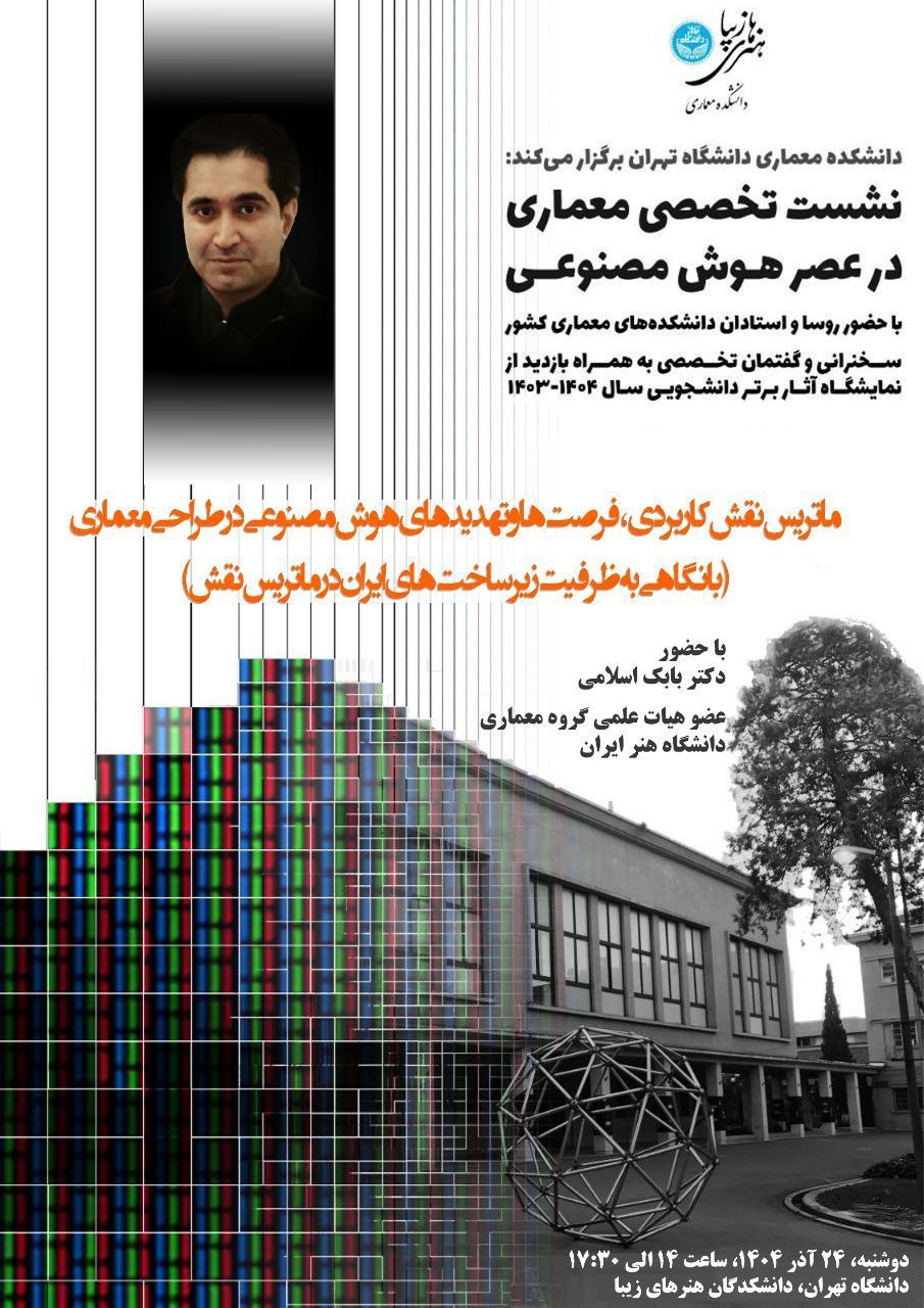 سخنرانی عضو هیاتعلمی دانشگاه هنر ایران در دانشکده معماری دانشگاه تهران معماری در عصر هوش مصنوعی ۲۶ آذر ۱۴۰۴ | ۰۸:۳۱ کد : ۷۴۱۶ در دانشکده چه میگذرد؟ ارسال به دیگران نام شما ایمیل شما ایمیل دریافتکننده ارسال انصراف تعداد بازدید:۴۰